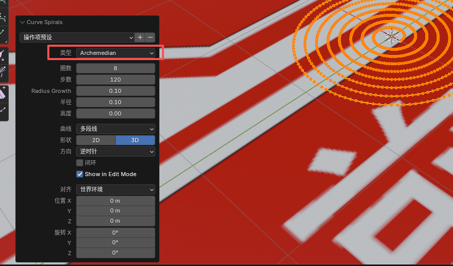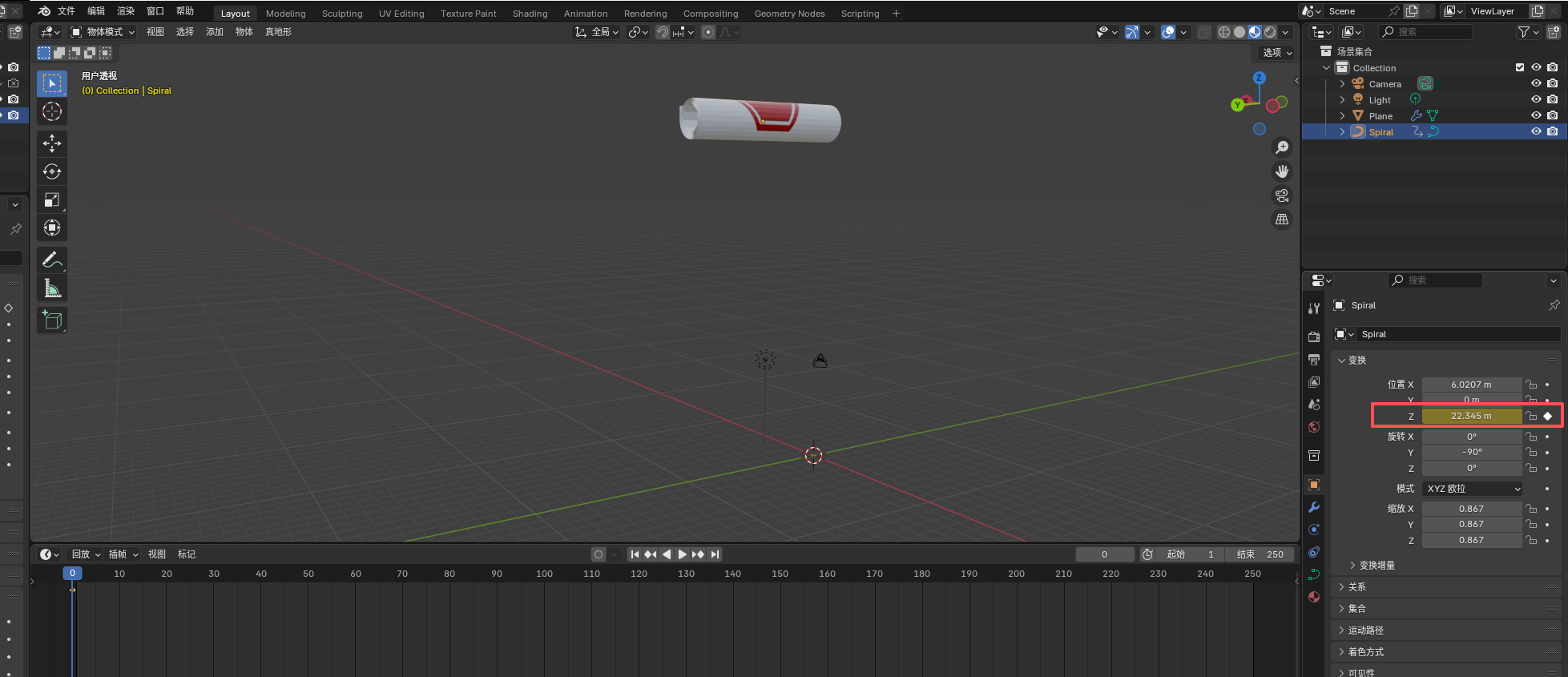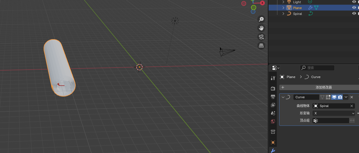 tab键回到物体模式,按s缩放螺旋尺寸,然后移动螺旋到平面的一端