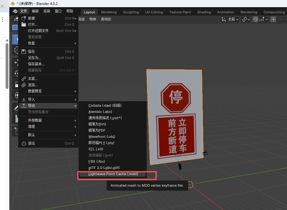 选中有动画的物体,应用所有的旋转缩放和位置,导出mdd文件