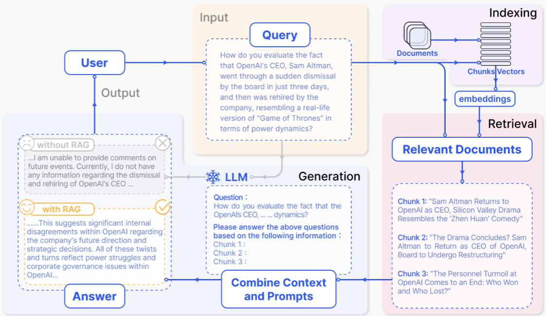 - Generation =>如何结合用户的提问和检索到的知识,让模型生成有用的答案。