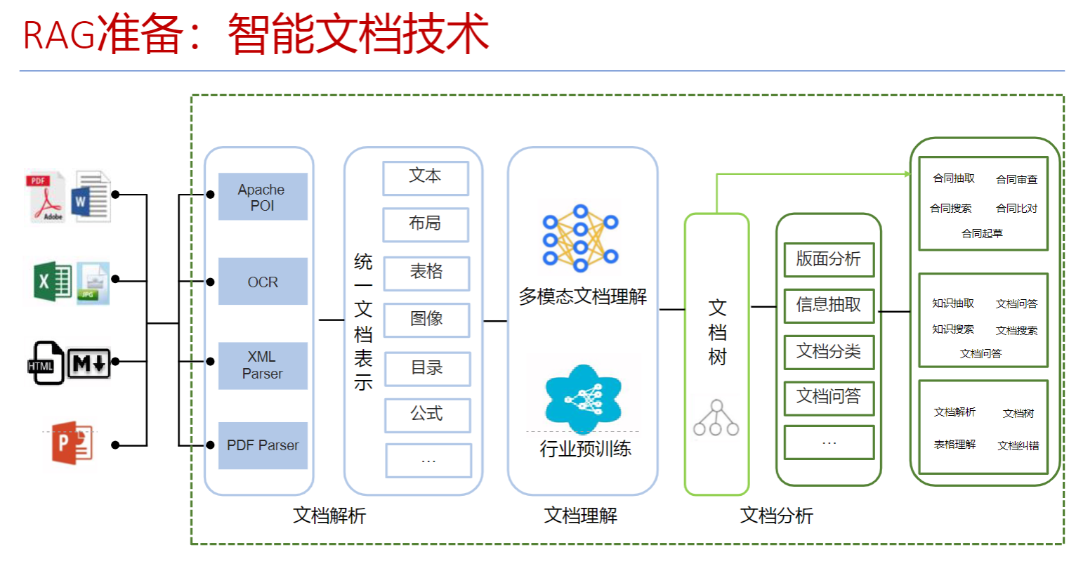 - 文档分块:将文档切分为适当大小的片段(chunks),以便后续检索。分块策略需要在语义完整性与检索效率之间取得平衡。